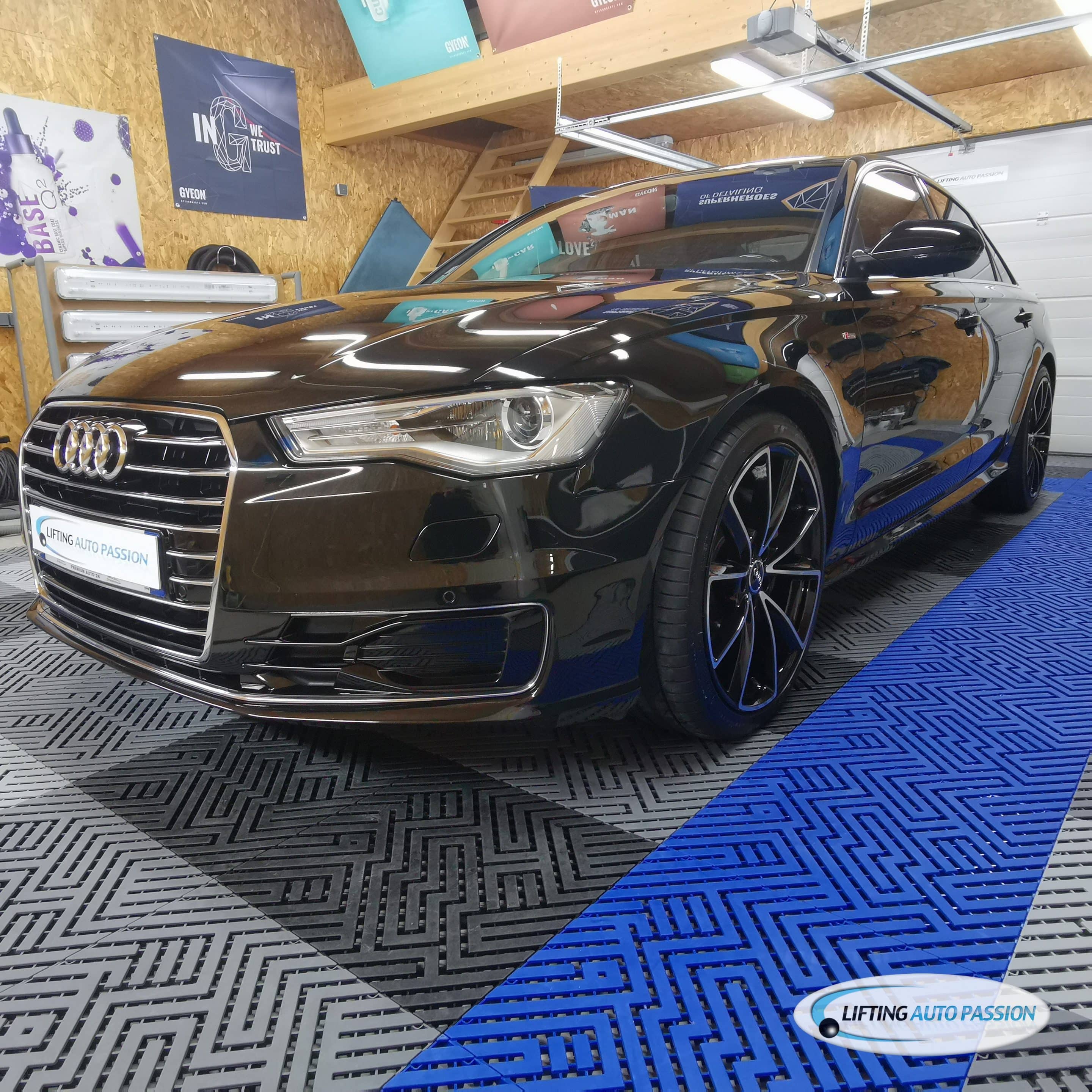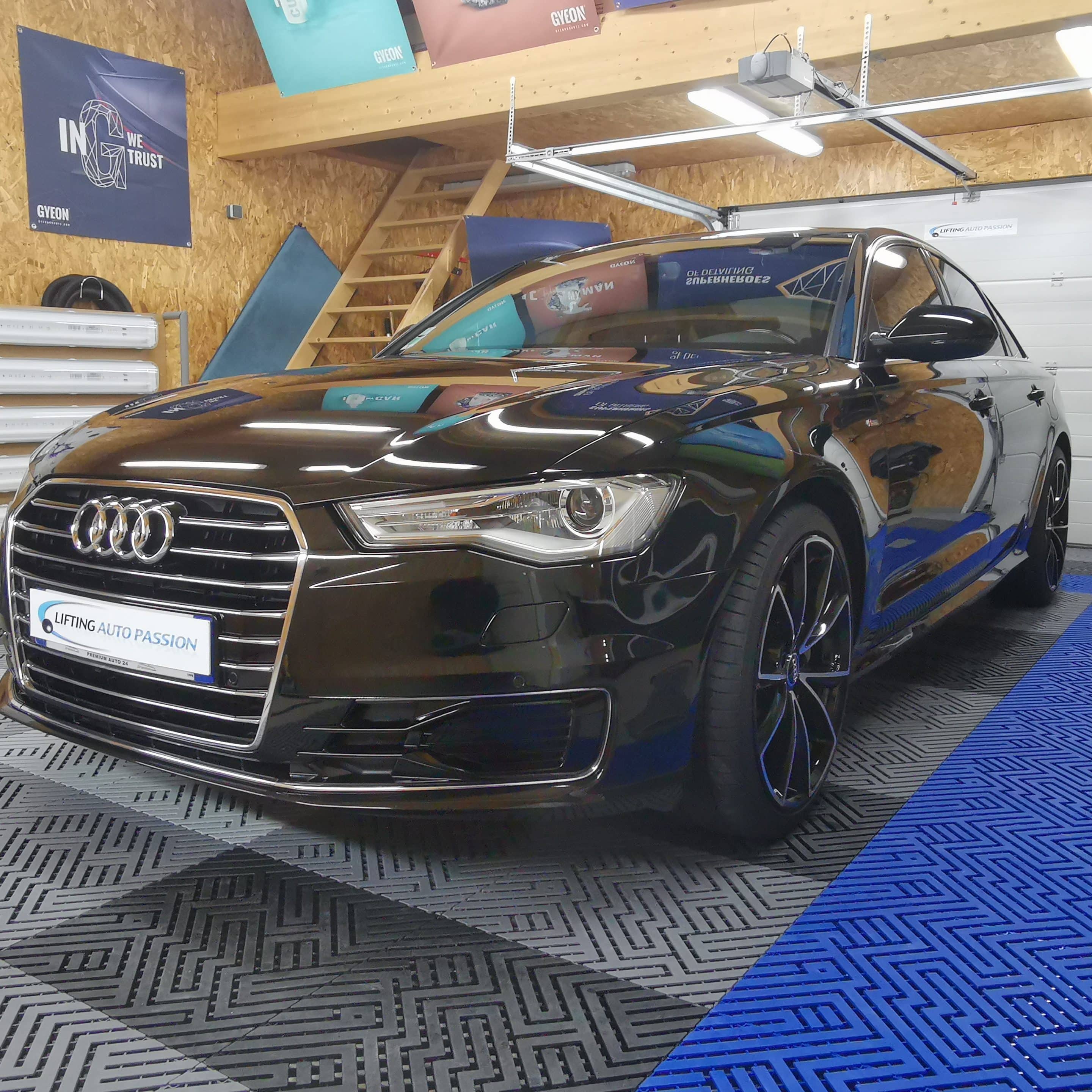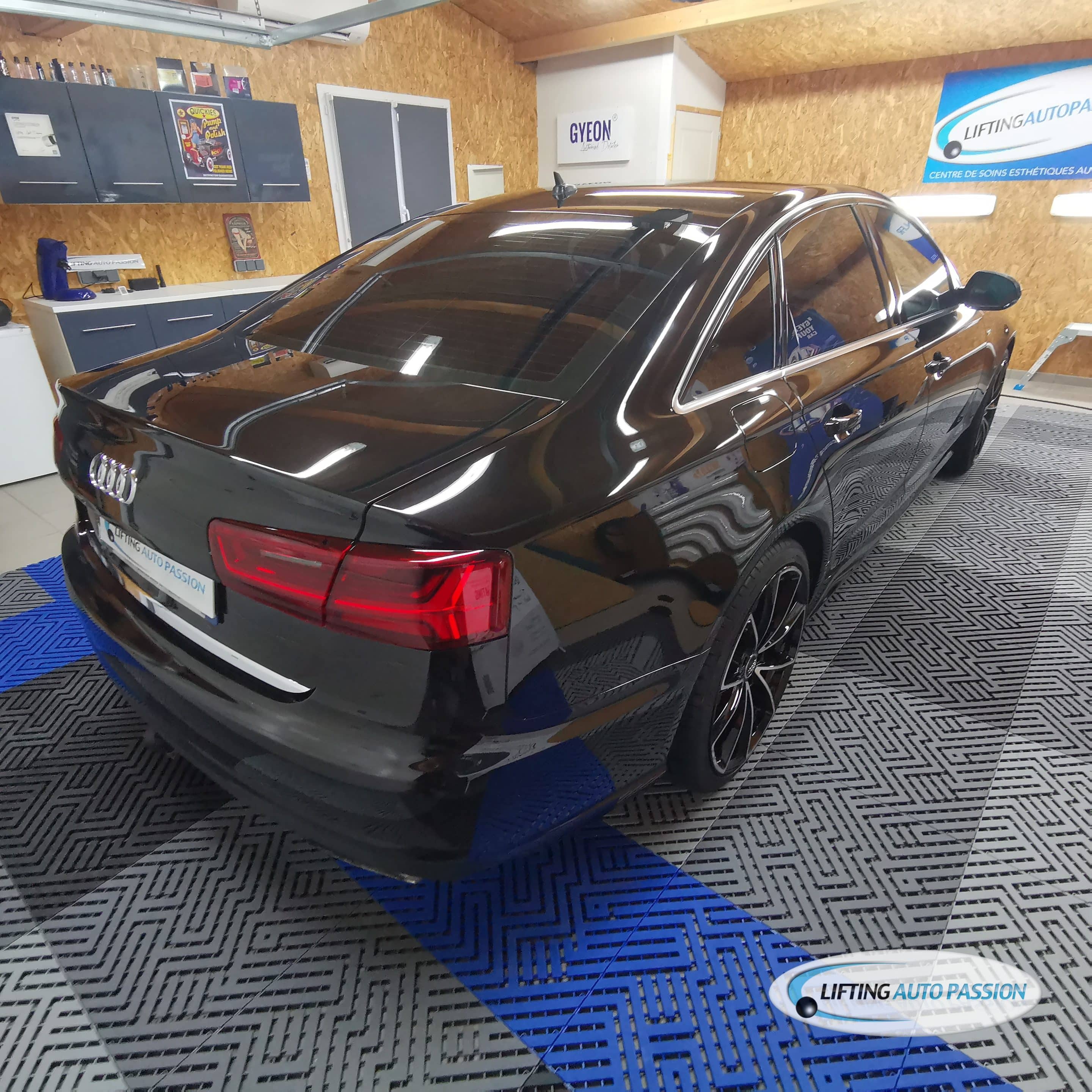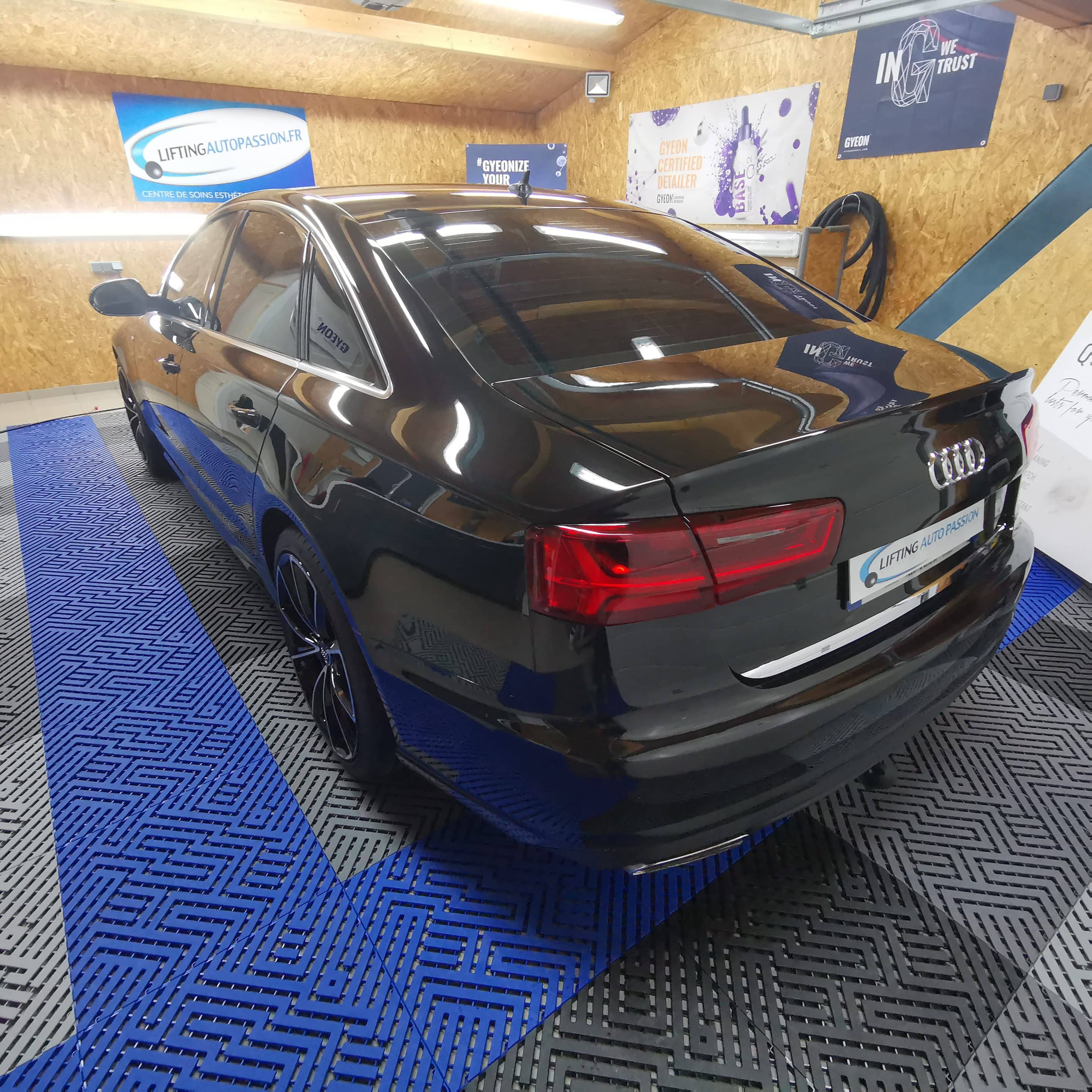 Avant de supprimer définitivement les défauts créés par les années de mauvaises techniques d’entretien, plusieurs étapes minutieuses sont nécessaires. Nous procédons dans un premier temps à un prélavage et un lavage, deux étapes effectuées soigneusement sur la carrosserie, les jantes , les passages de roues. Puis vient la phase de décontamination pour aller chercher les dernières impuretés incrustées dans les creux du vernis. Nous pouvons maintenant passer à la correction, réalisée en un passage sur l’ensemble de la carrosserie pour rectifier les défauts du vernis et obtenir une surface parfaitement lisse. C’est le lustrage qui permet enfin de redonner à notre Audi A6 sa brillance digne de son rang de véhicule premium. Le vernis, ainsi nourri et re-surfacé doit être protégé. Notre client à opté pour la protection GYEON Q² Pure.